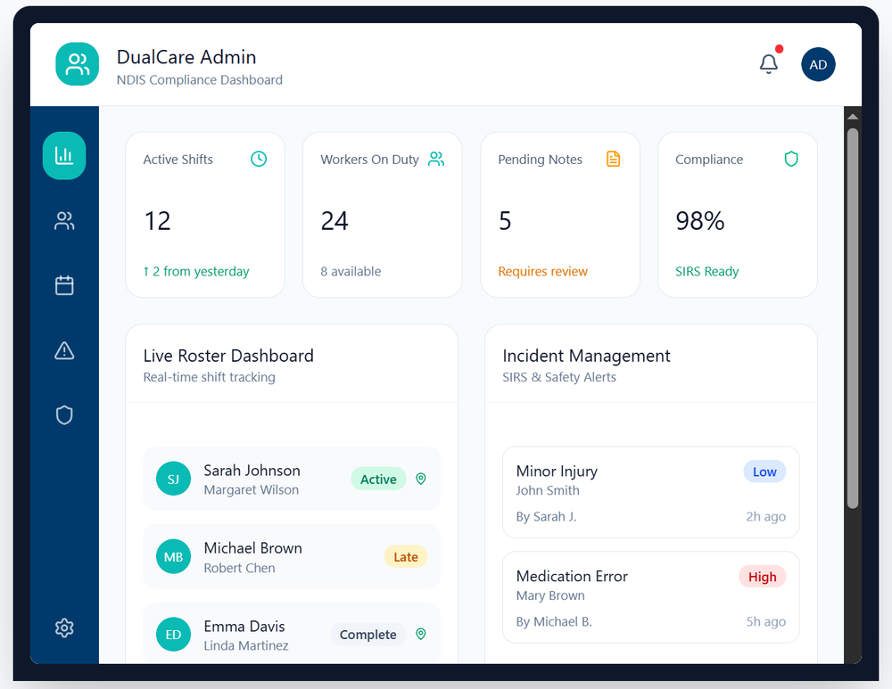 DualCare was built to solve a simple problem: the software used by NDIS and aged-care providers is outdated, confusing, and slows everyone down. Support work shouldn’t require five logins, endless emails, or systems that feel 10 years behind.